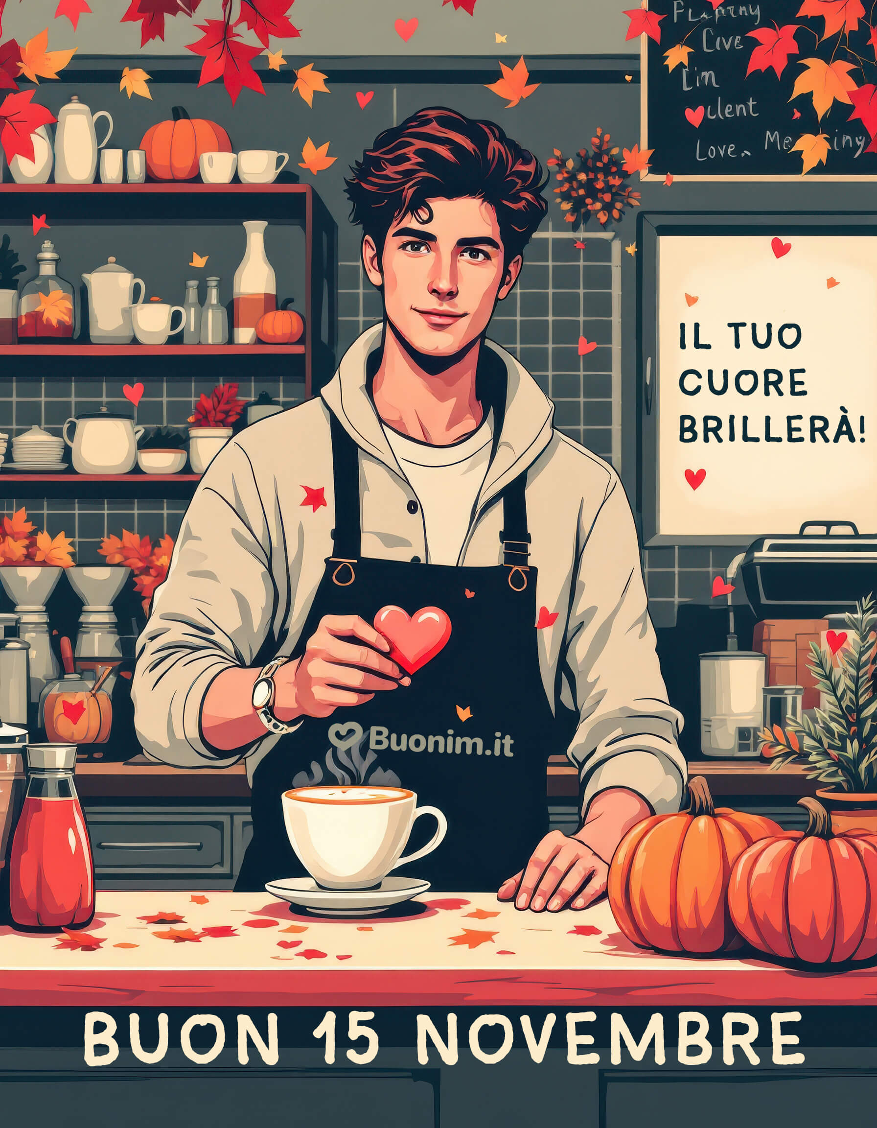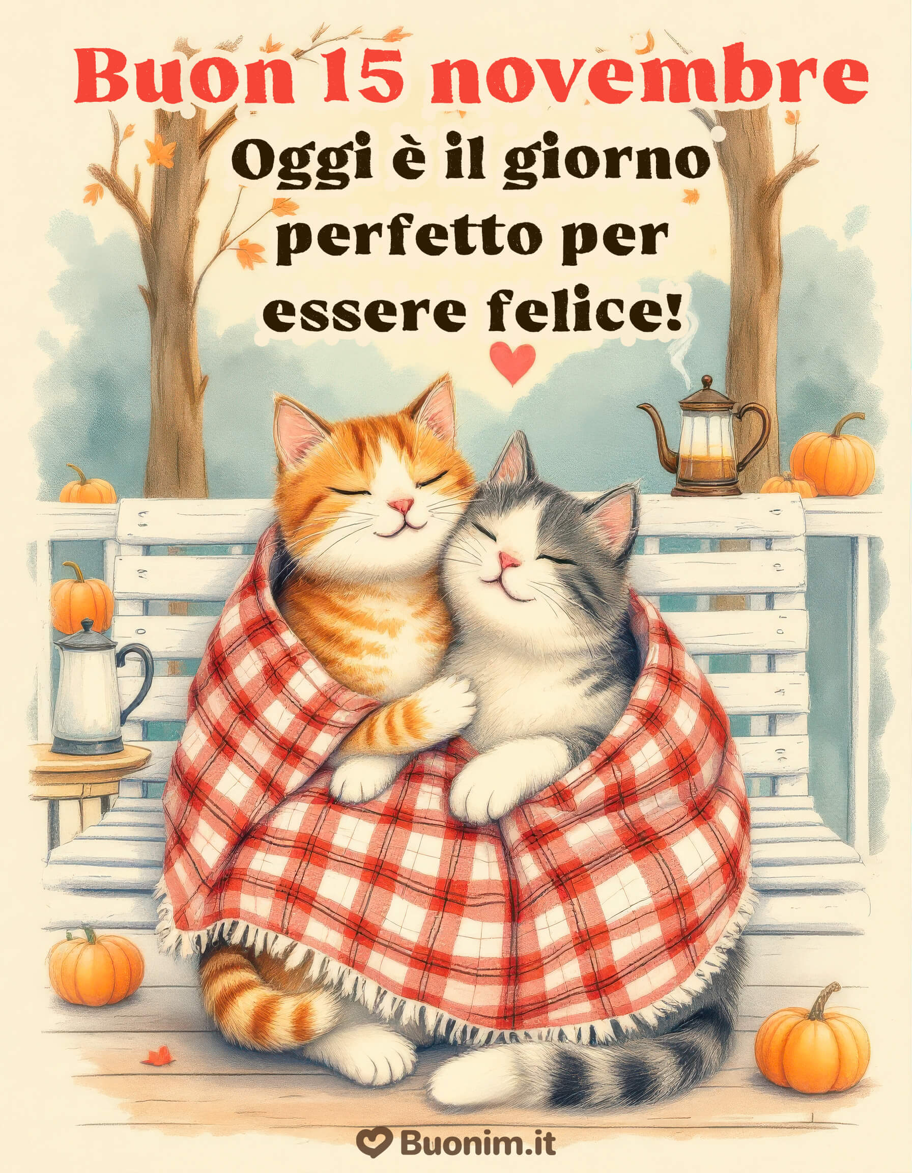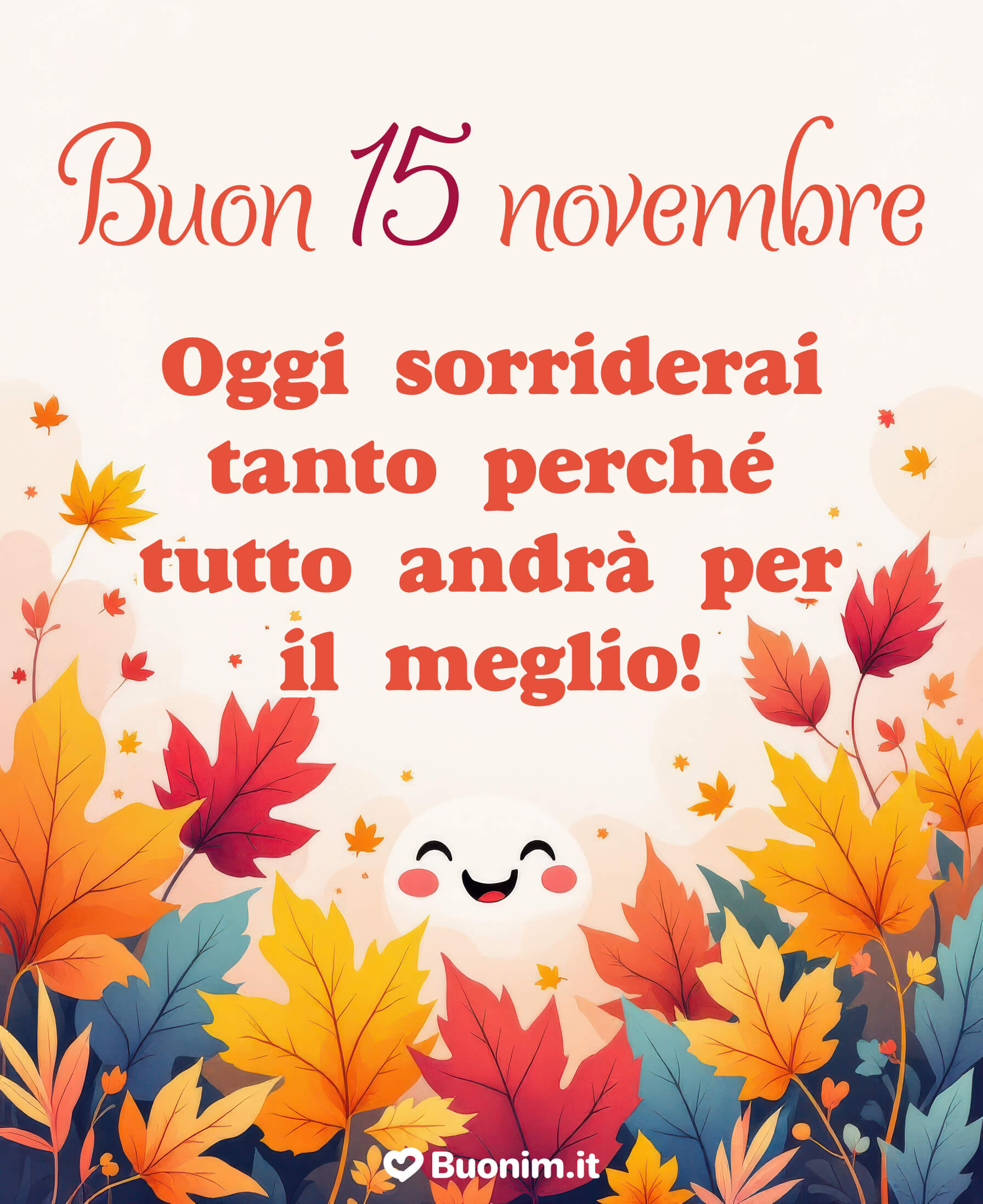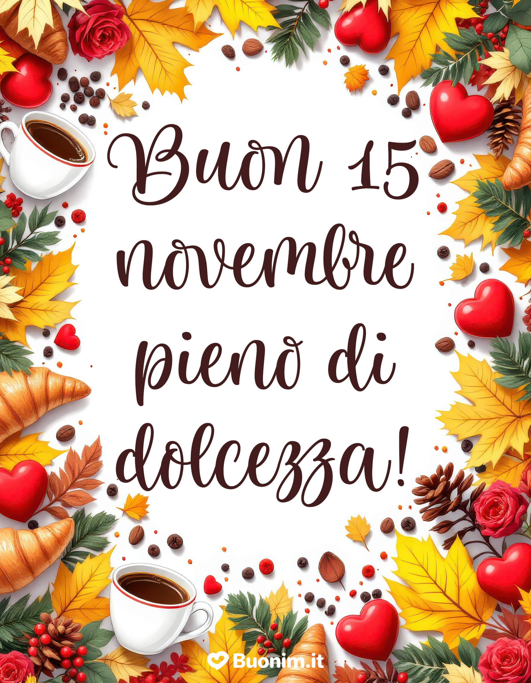Oggi, 15 novembre, l’autunno mostra il suo lato più dolce. L’aria profuma di legna e di castagne, le giornate si accorciano ma conservano una luce calda che invita alla calma. È il momento perfetto per rallentare un po’, sorseggiare un caffè e trovare bellezza nelle piccole cose. Ti auguro una giornata serena, piena di sorrisi sinceri e pensieri leggeri, come le foglie che danzano nel vento.