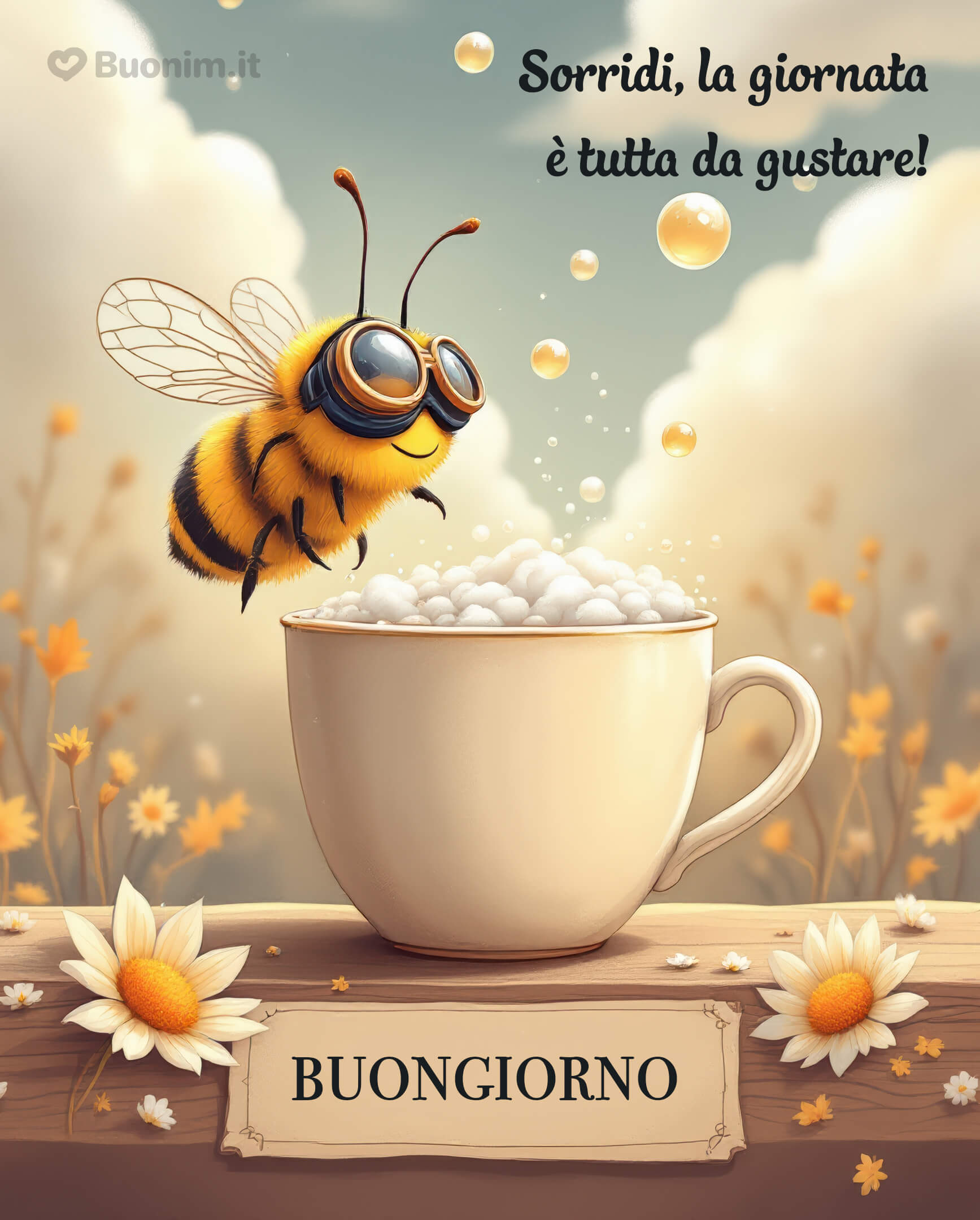 Immagine di buongiorno frizzante con l’ape del buonumoreScaricaLascia che questa piccola ape ti porti dolcezza e luce per un risveglio pieno di gioia e buonumore